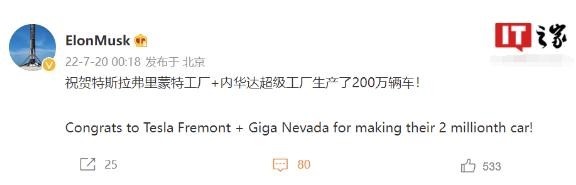 特斯拉 CEO 埃隆?馬斯克(Elon Musk)通過(guò)社交媒體表示,特斯拉弗里蒙特工廠(chǎng)和內華達超級工廠(chǎng)已生產(chǎn)了 200 萬(wàn)輛車(chē)。