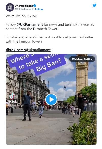 ▲ 7 月 27 日,英國議會(huì )在推特上宣布,已在 TikTok 上發(fā)布第一條視頻