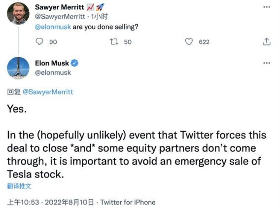 這封信發(fā)出之際,8 月 10 日,馬斯克在推特上對當地時(shí)間 8 月 5 日到 8 月 9 日之間出售價(jià)值 69 億美元的特斯拉股票作出回應,表示本次出售已暫告一段落。同時(shí),他還提到,本次減持與推特收購案相關(guān),是為了避免被強制執行收購后緊急拋售特斯拉股票以獲取資金。