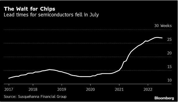 根據 Susquehanna Financial Group 的研究,7 月份的交貨時(shí)間(即半導體訂購與交付之間的時(shí)間差)平均為 26.9 周,而 6 月份修訂后的交貨時(shí)間為 27 周。交貨期已連續三個(gè)月縮短。