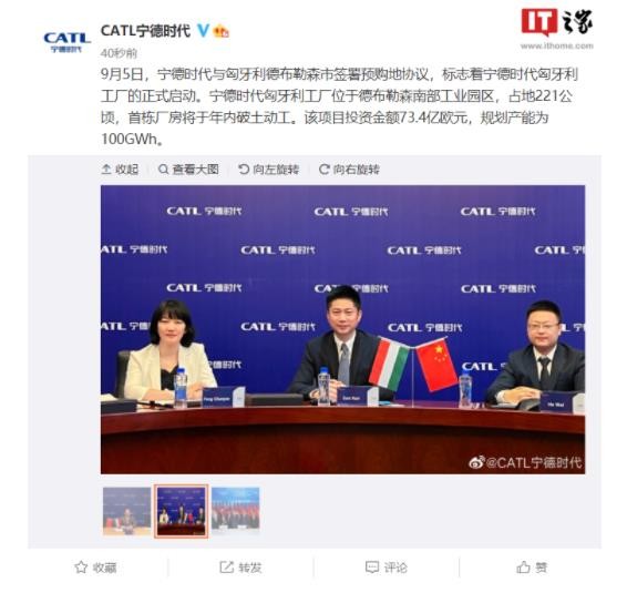 寧德時(shí)代與匈牙利德布勒森市簽署預購地協(xié)議 標志寧德時(shí)代匈牙利工廠(chǎng)正式啟動(dòng) 14:47:59