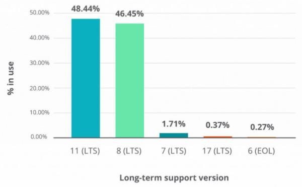 每個(gè) Java LTS 版本的使用百分比