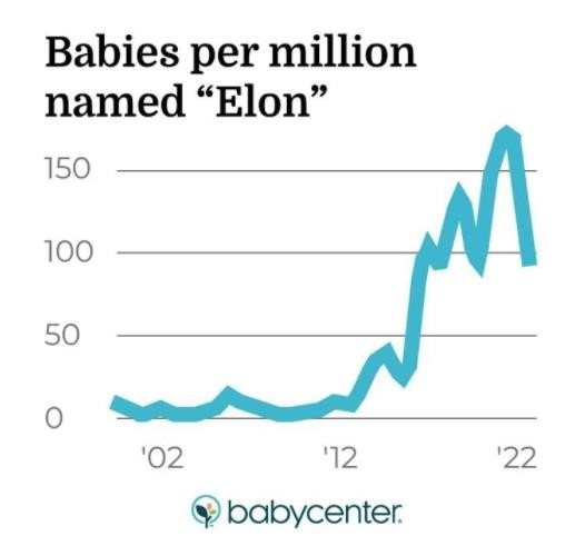 根據美國數字育兒網(wǎng)站 BabyCenter 周二發(fā)布的“2022 年最熱門(mén)嬰兒名字趨勢”報告,“埃隆”(Elon) 已不再是美國新生兒的熱門(mén)名字選擇了。