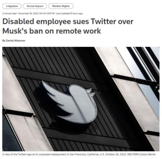據路透社,一項新的訴訟聲稱(chēng),Twitter 公司老板馬斯克要求員工停止遠程工作,并在“高強度下長(cháng)時(shí)間工作”,是對殘疾工人的歧視。