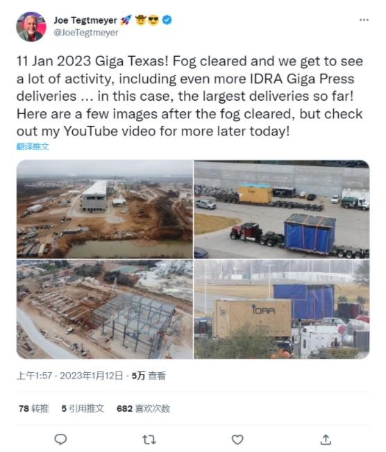 本周早些時(shí)候,無(wú)人機觀(guān)察員 @Joe Tegtmeyer 發(fā)現由意德拉集團(IDRA)供應的 9000 噸壓鑄機開(kāi)始在特斯拉得州工廠(chǎng)壓鑄車(chē)間開(kāi)始安裝。