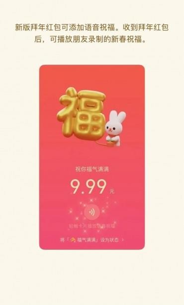 拜年紅包會(huì )隨機選擇一些吉利數字。比如:1.66、2.88、6.66、8.88、9.99 等。每個(gè)數字配套帶有不同的祝福語(yǔ)和不同的動(dòng)態(tài)效果。