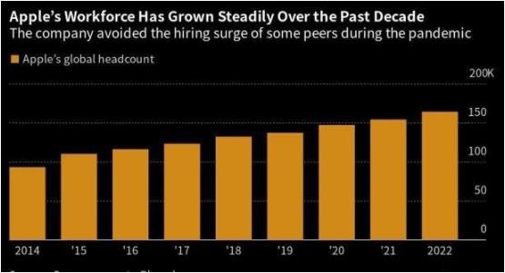 截至去年 9 月,蘋(píng)果公司共有 16.4 萬(wàn)名員工。在疫情期間,該公司沒(méi)有像其他大型科技公司那樣迅速擴大員工規模,也因此避免了大規模裁員。