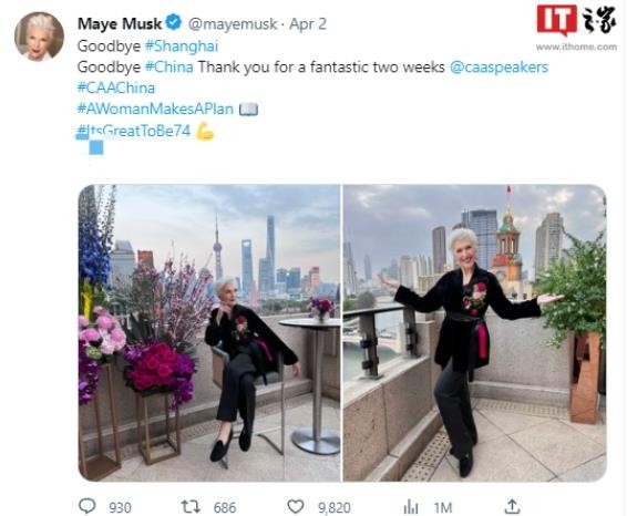 美國億萬(wàn)富翁、特斯拉創(chuàng )始人、推特 CEO 埃隆?馬斯克的母親梅耶?馬斯克近日結束了她的中國之行,她在社交媒體上分享了她在上海、湖州、廣州、蘇州、廈門(mén)、成都、武漢等地的旅游見(jiàn)聞,稱(chēng)贊中國的美景和友好的人們,感謝中國給她帶來(lái)了兩周的美好時(shí)光。