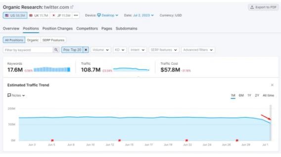 Glenn Gabe 在 Twitter 上分享了一張第三方工具 Semrush 的截圖,顯示 Twitter 在谷歌搜索中的可見(jiàn)度下降: