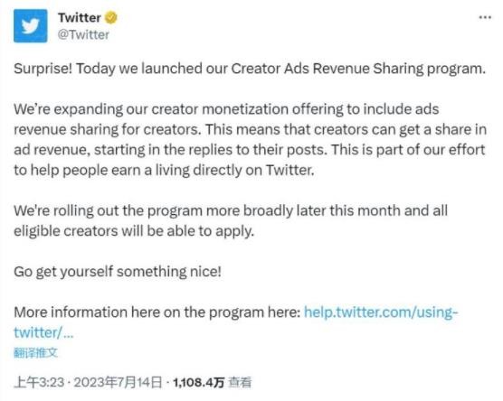 據推特官方消息,推特今天推出了創(chuàng )作者廣告收益分享計劃。