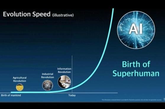 而在 6 月 21 日股東大會(huì )上,軟銀孫正義展示了一張名為 “進(jìn)化速度(Evolution Speed)”的幻燈片,展示了人類(lèi)進(jìn)化的圖表。從人類(lèi)的誕生到農業(yè)革命,曲線(xiàn)完全平緩,直到工業(yè)革命到信息革命的過(guò)渡期間,曲線(xiàn)才有些許上升。他同時(shí)表示,在未來(lái)幾年中,因人工智能的發(fā)展,曲線(xiàn)會(huì )陡然上升,斜率接近垂直線(xiàn)。