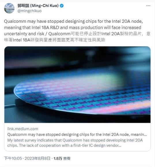 郭明錤今晚發(fā)布最新研究報告。他表示,最新調查顯示高通已經(jīng)停止開(kāi)發(fā) Intel 20A 芯片。