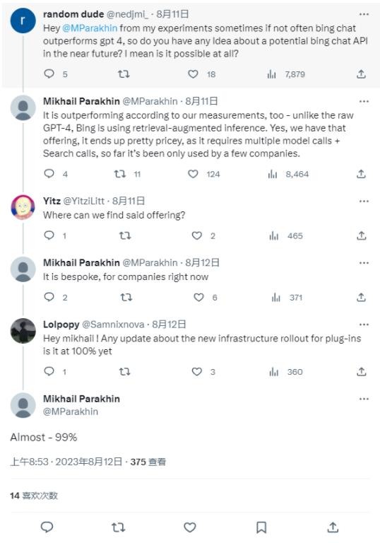 根據 Microsoft Bing 首席執行官 Mikhail Parakhin 的說(shuō)法,Bing Chat 升級已完成 99%,基本上已經(jīng)可以支持上線(xiàn)。