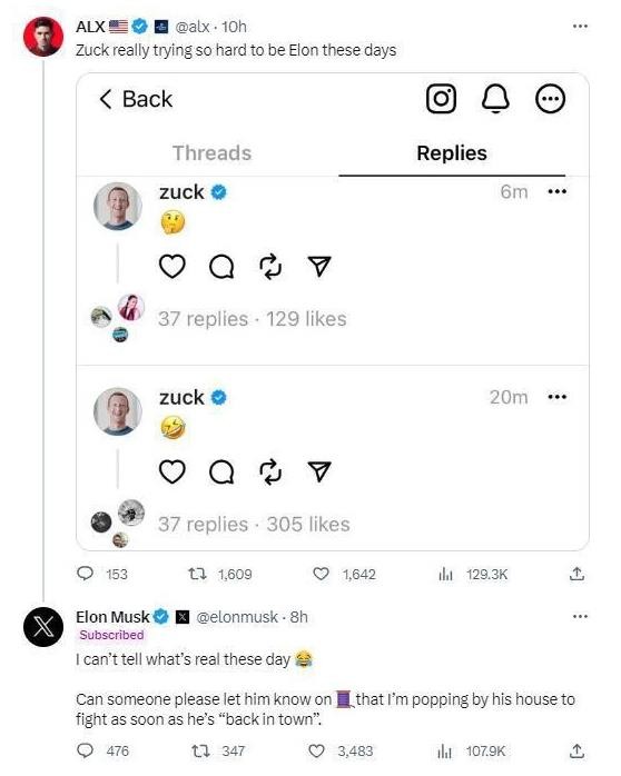 馬斯克在帖子中寫(xiě)道:“我現在分不清什么是真的。誰(shuí)能在 Threads 上告訴他(扎克伯格),他一‘回來(lái)’,我就會(huì )去他家打比賽。”
