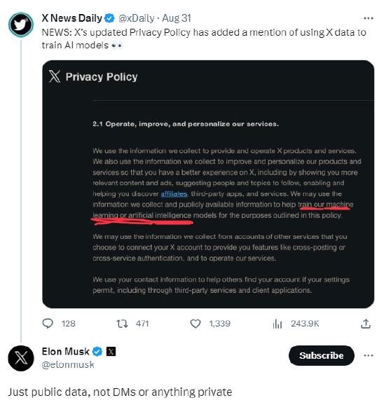 對此,馬斯克在X上回應稱(chēng),X只會(huì )使用公開(kāi)的信息來(lái)訓其練人工智能模型,不會(huì )使用任何私有的內容。