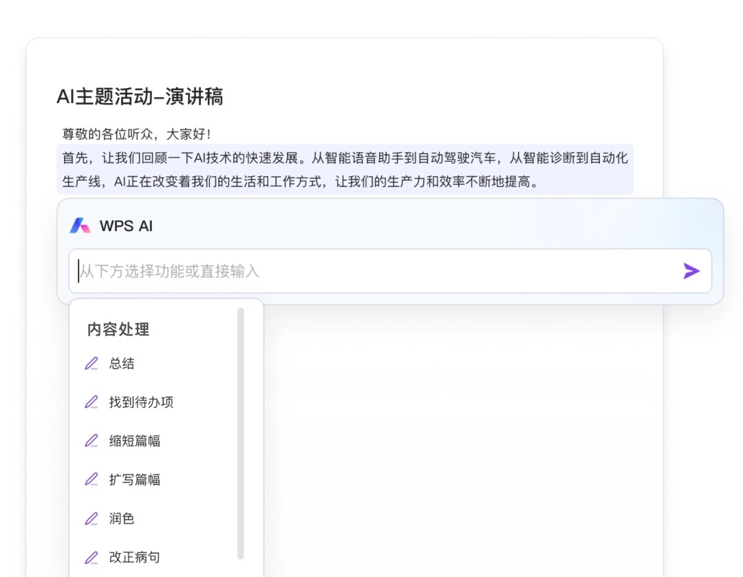此外,金山辦公還提供了多個(gè) AI 能力體驗模板,用戶(hù)只需點(diǎn)擊輸入指令,即可快速體驗智能文檔的 AI 能力。