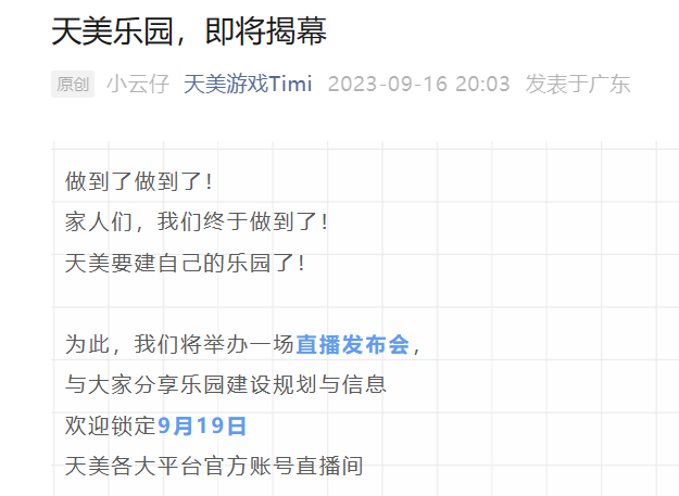 騰訊天美游戲官宣,將于明日(9 月 19 日)中午 12 點(diǎn)舉行“天美樂(lè )園發(fā)布會(huì )”,官方稱(chēng)“天美要建自己的樂(lè )園了”,將在發(fā)布會(huì )上與大家分享樂(lè )園建設規劃與信息。