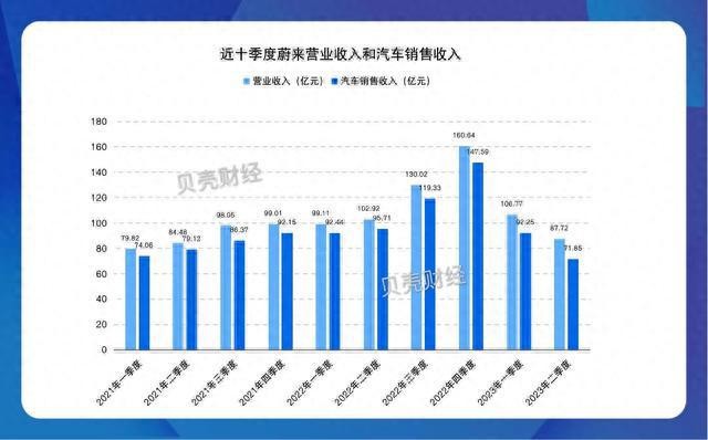 近十季度蔚來(lái)營(yíng)業(yè)收入和汽車(chē)銷(xiāo)售收入。圖片來(lái)源網(wǎng)絡(luò )/侵刪
