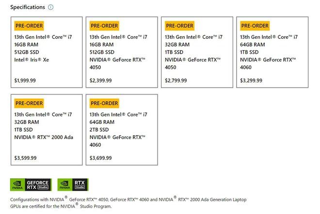 價(jià)格方面,Surface Laptop Studio 2 的起售價(jià)位 1999.99 美元,把配置全部拉滿(mǎn)則需要 3699.99 美元。