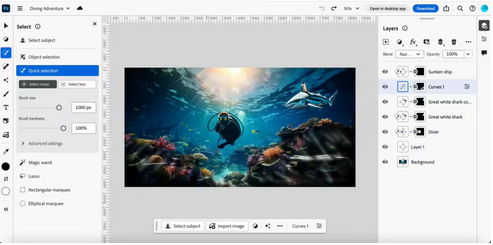 Photoshop 網(wǎng)頁(yè)版還提供了許多桌面版最常用的工具,但重新設計了布局,為 Photoshop 新用戶(hù)提供了更“簡(jiǎn)化”的用戶(hù)體驗。其中包括今年早些時(shí)候添加到桌面 Photoshop 應用中的上下文任務(wù)欄功能,它會(huì )建議用戶(hù)在工作流程中采取最相關(guān)的步驟。