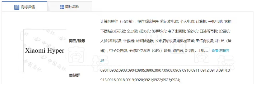 商標詳情顯示,“小米澎湃”、“XIAOMI HYPER”商標申請日期分別為 2023 年 9 月 15 日和 9 月 5 日,商標狀態(tài)均為“等待實(shí)質(zhì)審查”。小米為這兩款商標添加了多個(gè)類(lèi)似群,包括操作系統程序、計算機軟件(已錄制)、 筆記本電腦、個(gè)人電腦、芯片(集成電路)等,該商標也為小米新系統的命名留下了想象空間。