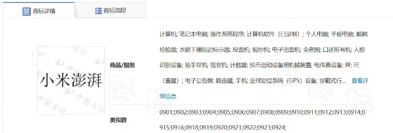 從國家知識產(chǎn)權局商標局獲悉,小米科技有限責任公司近期申請注冊“小米澎湃”、“XIAOMI HYPER”等商標,國際分類(lèi)包含 9 類(lèi)科學(xué)儀器。