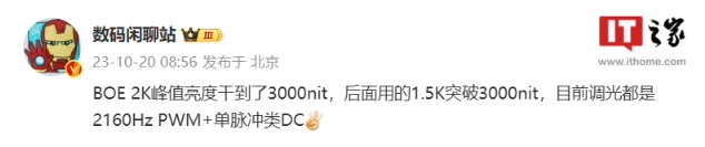 在該消息官宣之前,博主 @數碼閑聊站 爆料稱(chēng),一加新機搭載的 2K 屏幕,峰值亮度達到了 3000nit,后面機型用的 1.5K 屏幕突破 3000nit,目前調光都是 2160Hz PWM + 單脈沖類(lèi) DC。
