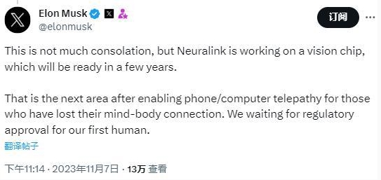 隨后,日常高強度網(wǎng)上沖浪的馬斯克回復了這條帖子。世界首富表示:“雖然這可能并不能給你太多安慰,但是 Neuralink 正在研發(fā)一種視覺(jué)芯片,預計幾年后就能完成。在幫助那些失去了身體與大腦連接的人實(shí)現手機/電腦心靈感應之后,這是我們的下一個(gè)研究領(lǐng)域。我們正在等待監管部門(mén)批準我們的第一位人類(lèi)實(shí)驗對象。”