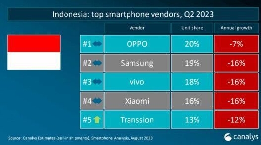 憑借部分可借鑒的市場(chǎng)經(jīng)驗與極具競爭力的產(chǎn)品,中國手機廠(chǎng)商們在印尼智能手機市場(chǎng)如魚(yú)得水。據調研機構Canalys的最新統計,2023年二季度在印度尼西亞市場(chǎng),OPPO以20%份額位列第一,三星緊隨其后,份額為19%,vivo、小米和傳音分別位列第三至第五,市場(chǎng)份額分別為18%、16%和13%。