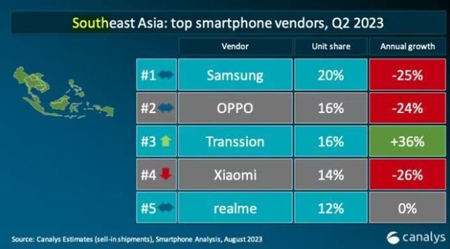 通過(guò)十年的發(fā)展,如今包括OPPO在內的中國手機廠(chǎng)商甚至占據了東南亞市場(chǎng)的半壁江山。Canalys發(fā)布的東南亞地區2023年第二季度智能手機出貨量數據顯示,三星、OPPO、傳音、小米、realme位列前五,市場(chǎng)份額分別為20%、16%、16%、14%及12%,中國廠(chǎng)商的市場(chǎng)份額合計為58%,占據半壁江山。