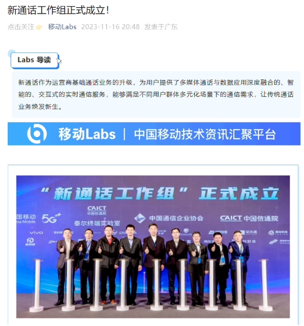 據中國移動(dòng)消息,為進(jìn)一步推動(dòng)新通話(huà)應用從點(diǎn)狀示范向規?;l(fā)展演進(jìn)。11 月 15 日,在第二十屆增值電信及虛擬運營(yíng)年會(huì )--5G 消息創(chuàng )新論壇上,中國通信企業(yè)協(xié)會(huì )攜手中國信息通信研究院正式成立“新通話(huà)工作組”。