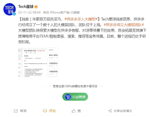 據 Tech 星球,拼多多已經(jīng)成立了一個(gè)數十人的 AI 大模型團隊,團隊位于上海。