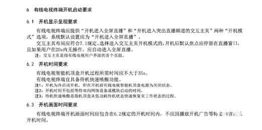 這也就意味著(zhù)未來(lái)的有線(xiàn)電視以及IPTV終端在開(kāi)機后會(huì )以默認的“開(kāi)機進(jìn)入全屏直播”模式運行,在用戶(hù)誤操作20秒之后,自動(dòng)進(jìn)入到全屏直播頁(yè)面;同時(shí),規定還要求有線(xiàn)電視智能機頂盒開(kāi)機過(guò)程所需時(shí)間應不大于35s;要求用戶(hù)界面宜面向老年、未成年等用戶(hù)群體提供特定的服務(wù)模式,并提供便捷切換入口。