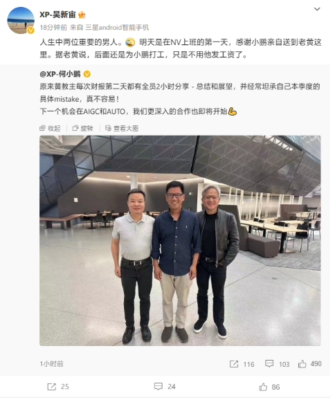 圖片顯示,何小鵬親自送吳新宙前去英偉達總部“報到”,何小鵬還發(fā)文稱(chēng)“原來(lái)黃教主每次財報第二天都有全員 2 小時(shí)分享 - 總結和展望,并經(jīng)常坦承自己本季度的具體 mistake,真不容易!下一個(gè)機會(huì )在 AIGC 和 AUTO,我們更深入的合作也即將開(kāi)始。”