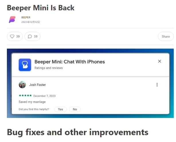 Beeper 今天再次發(fā)布博文《Beeper Mini Is Back》,表示這款應用重新上架。