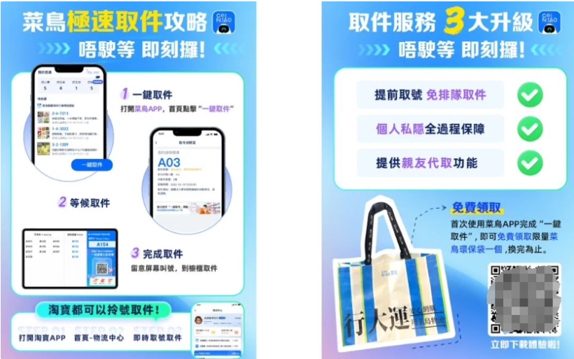 此外,為吸引用戶(hù)體驗此項新服務(wù),菜鳥(niǎo)還將為首次使用 CAINIAO App 取件的用戶(hù)免費發(fā)放菜鳥(niǎo)快遞手拎包。