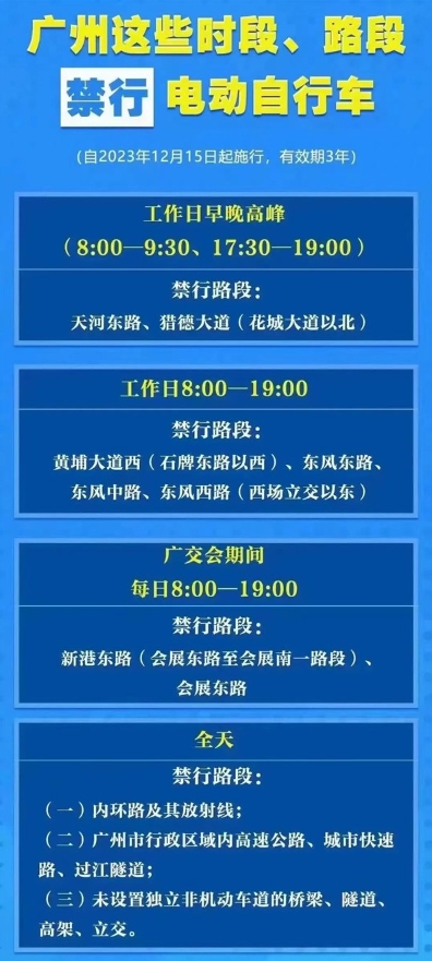 舉辦中國進(jìn)出口商品交易會(huì )期間,每天8時(shí)至19時(shí)禁止電動(dòng)自行車(chē)在新港東路(會(huì )展東路至會(huì )展南一路段)、會(huì )展東路行駛。
