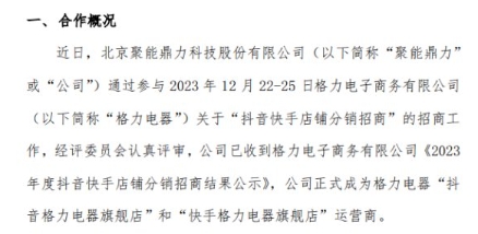 聚能鼎力近日發(fā)布公告,北京聚能鼎力科技股份有限公司(以下簡(jiǎn)稱(chēng)“聚能鼎力”或“公司”)通過(guò)參與2023年12月22-25日格力電子商務(wù)有限公司(以下簡(jiǎn)稱(chēng)“格力電器”)關(guān)于“抖音快手店鋪分銷(xiāo)招商”的招商工作,經(jīng)評委員會(huì )認真評審,公司已收到格力電子商務(wù)有限公司《2023年度抖音快手店鋪分銷(xiāo)招商結果公示》,公司正式成為格力電器“抖音格力電器旗艦店”和“快手格力電器旗艦店”運營(yíng)商。