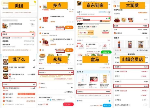 除了盒馬外,在山姆會(huì )員店、大潤發(fā)、美團、餓了么、京東到家等主要生鮮電商、本地生活平臺上購物也需要支付包裝費或打包費,收取的費用為 1 至 2 元不等。