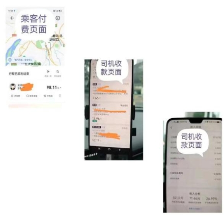 東南大學(xué)交通法治與發(fā)展研究中心執行主任、中國城市公共交通協(xié)會(huì )網(wǎng)約車(chē)分會(huì )會(huì )長(cháng)顧大松曬出的賬單截圖顯示,一位乘客打車(chē),訂單結束實(shí)付 98.11 元。但蹊蹺的是,同一段行程,司機端卻顯示乘客付費為 71.46 元,司機實(shí)收 52.17 元。中間憑空消失了 26.65 元,超過(guò)司機實(shí)收的一半。