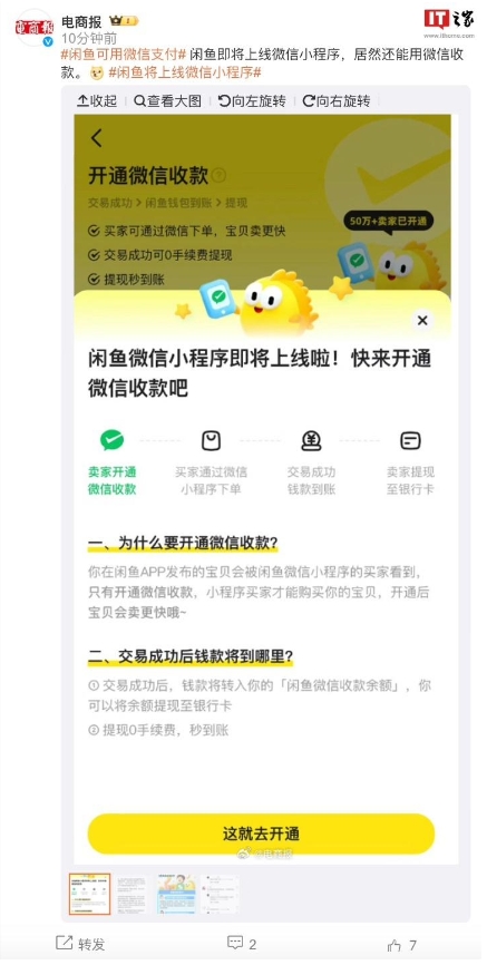 微博出現“閑魚(yú)可用微信支付”話(huà)題,流傳截圖展示有“閑魚(yú)微信小程序即將上線(xiàn),快來(lái)開(kāi)通微信收款”字樣。