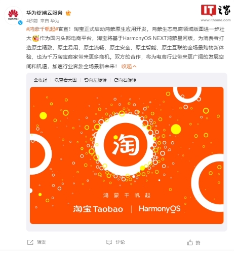淘寶與華為舉辦鴻蒙合作簽約儀式,宣布將基于 HarmonyOS NEXT 啟動(dòng)鴻蒙原生應用開(kāi)發(fā)。