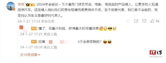 理想汽車(chē) CEO 李想發(fā)文,表示不會(huì )請明星代言,堅持認為車(chē)主是最好的代言人;2024 年會(huì )嘗試一下少量熱門(mén)綜藝節目、電影、電視劇的產(chǎn)品植入,這類(lèi)植入相比營(yíng)收規模而言費用并不多。