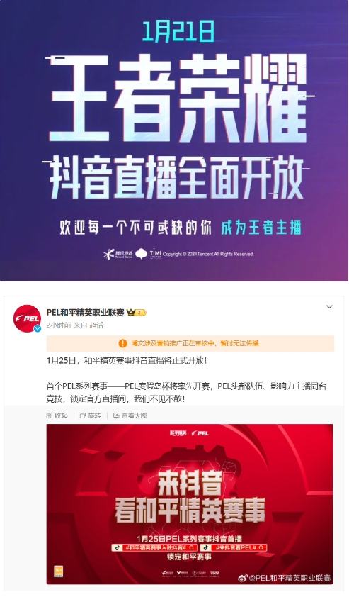 騰訊和字節跳動(dòng)此前已就直播進(jìn)行“破冰”合作,《王者榮耀》、《和平精英》賽事均已開(kāi)放抖音直播。