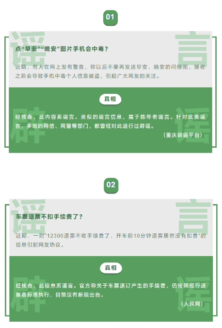 微信安全中心今天傍晚公布了 2024 年 1 月朋友圈十大謠言,包含“點(diǎn)‘早安’‘晚安’圖片手機會(huì )中毒?”“車(chē)票退票不扣手續費了?”等。