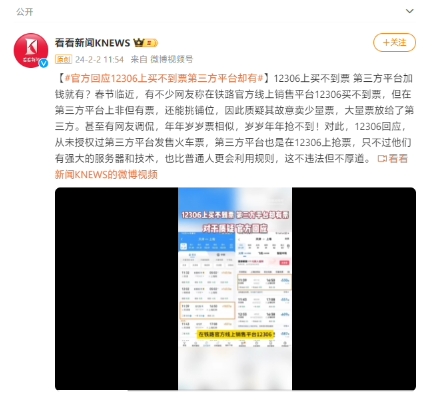 鐵路 12306 對此回應,從未授權過(guò)第三方平臺發(fā)售火車(chē)票,第三方平臺也是在 12306 上搶票。