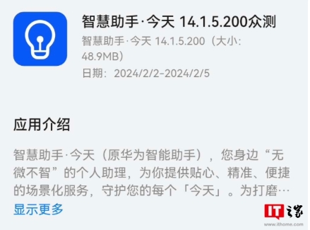 華為昨天為智慧助手推送了 14.1.5.200 眾測更新,包體積為 48.9MB,主要改進(jìn)了 12306 火車(chē)信息同步功能。