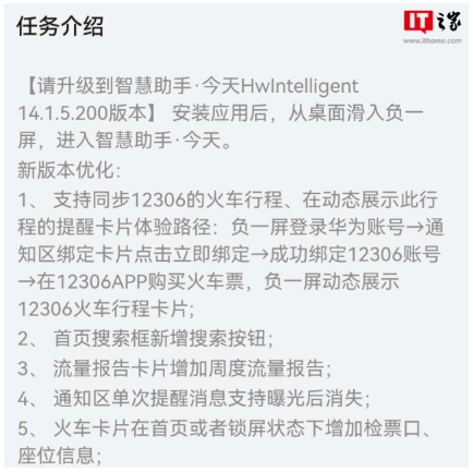 華為智慧助手獲推 14.1.5.200 眾測更新:支持綁定 12306 負一屏同步火車(chē)行程信息等