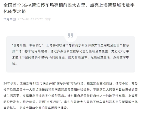 上海移動(dòng)聯(lián)合華為在浦東新區前灘太古里完成全國首個(gè)智慧泊車(chē)地下停車(chē)場(chǎng)網(wǎng)絡(luò )建設。該停車(chē)場(chǎng)通過(guò)多點(diǎn)位新型數字化室分基站全面覆蓋,可為超過(guò) 7 萬(wàn)平米的地下空間提供 5G-A 網(wǎng)絡(luò )覆蓋。