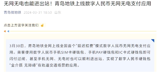 青島地鐵全網(wǎng)上線(xiàn)全國首個(gè)“延遲扣費”模式數字人民幣無(wú)網(wǎng)無(wú)電支付應用。乘客使用數字人民幣手機 SIM 卡硬錢(qián)包、手機 PAY 硬錢(qián)包和 IC 卡式硬錢(qián)包即可閃付過(guò)閘,在手機無(wú)網(wǎng)、無(wú)電時(shí),也可以順利進(jìn)出站。